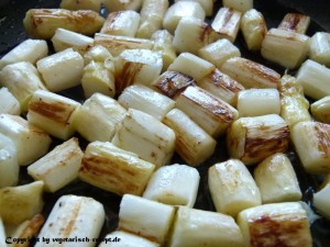 Öl in der Pfanne erhitzen und währenddessen die geschälten Spargel in ca. 2 cm lange Stücke schneiden.