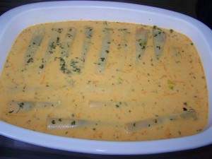 Die Soße kurz aufkochen lassen. Über die Cannelloni geben.