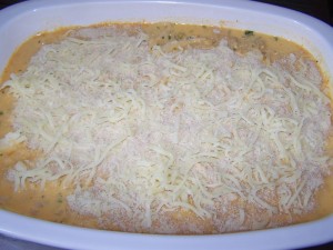Den Käse mit den Semmelbröseln mischen und auf die Soße streuen.