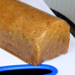 Einfach den Seitanteig in die Terinenform geben, statt in die Stofftücher…