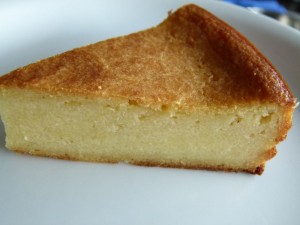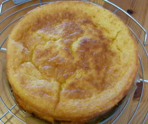Habe für ’ne durchschnittliche runde Backform (26 cm) die doppelte Menge genommen (bleibt trotzdem nichts übrig …), beim zweiten Versuch etwas reichlicher Zitrone verwendet und in Rum eingelegte und bemehlte Rosinen mit reingebacken.