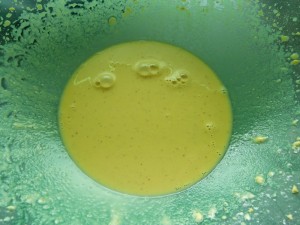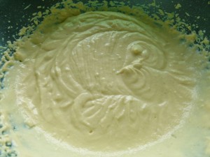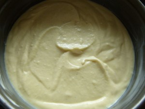 Sojamehl und Wasser mit dem Handrührer gut verrühren. Zitronensaft, Vanillezucker und Puddingpulver (ganz einfaches reicht völlig aus … ich hatte nur kein anderes mehr da) dazu geben und zu einer glatten Masse mixen.